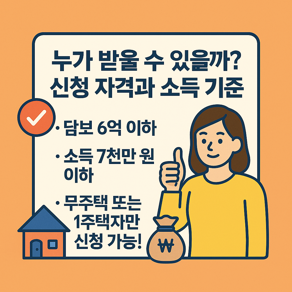 - 소득 기준: 부부합산 연 7천만 원 이하 (신혼·다자녀는 최대 1억 원까지 완화)